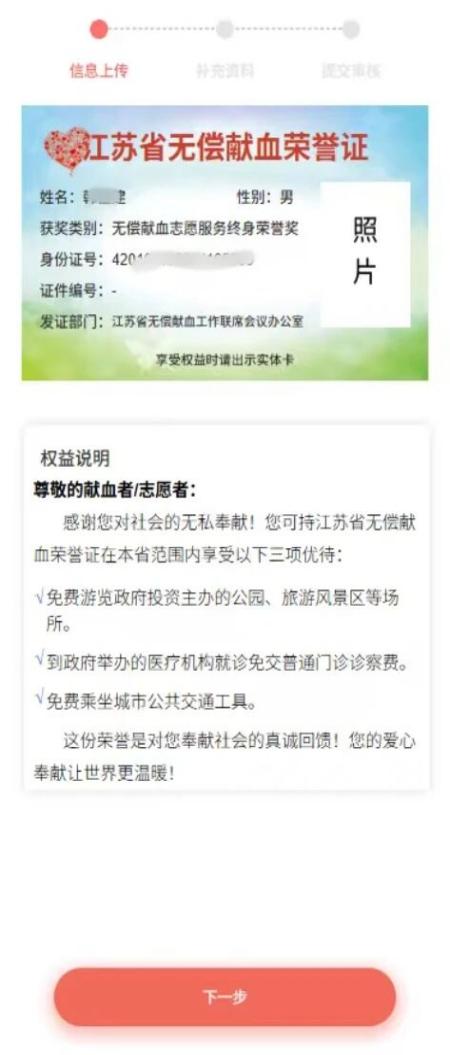 2.江苏省内献血满4000mL:若您尚未获得国家无偿献血奉献奖,但在江苏省内已累计捐献血液满4000mL,请选择此选项上传信息。