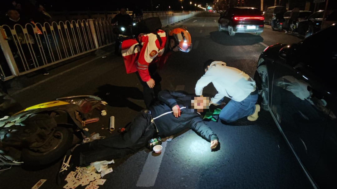 当晚10点,南京市红十字会应急救护先锋队队员马小乐在回家途中偶遇交通事故,发现伤者头部出血后,他立即取出随身急救包规范完成头部包扎止血,稳定伤者状况,待120急救人员到来后主动配合完成转运与现场交接,确认伤者得到妥善处置后才离开现场。