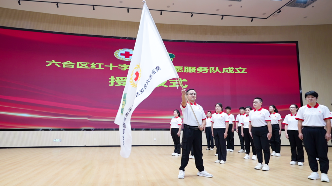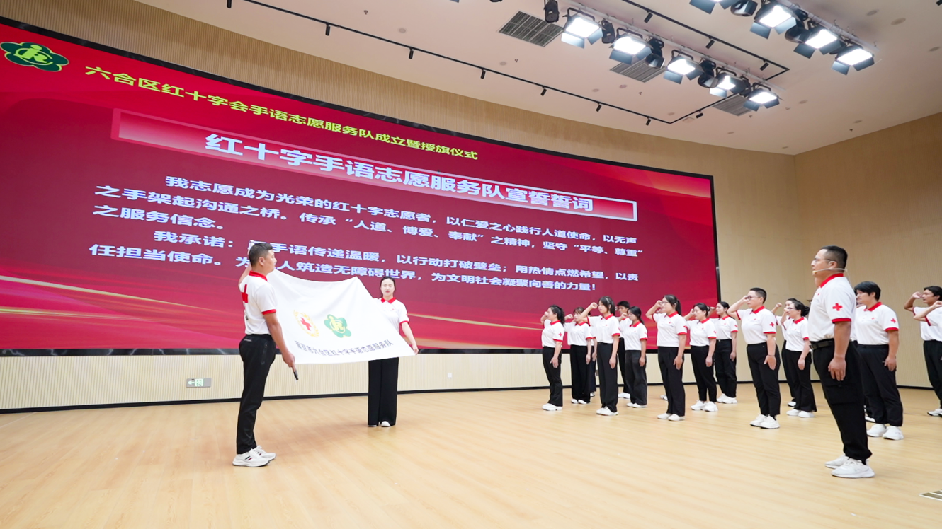 在随后的授旗仪式上,六合区红十字手语志愿服务队队长胡玉志郑重接过旗帜,并带领全体志愿者庄严宣誓,肩负起“以手传情、以爱破障”的使命,也标志着全市首家红十字手语志愿服务队正式诞生。