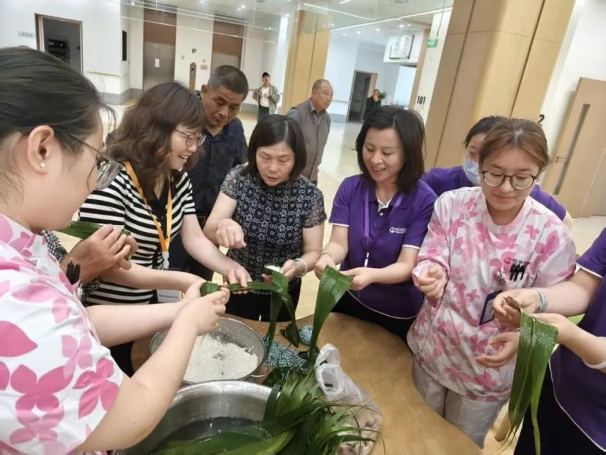 在康养中心室内活动区域,工作人员与老人们围聚在桌旁,一同包粽子;翠绿粽叶、雪白糯米整齐摆放,大家一双双巧手翻飞,将对老人的关爱包进粽子里,大家一边包粽子,一边亲切交谈,现场欢声笑语不断,弥漫着浓浓的温情与节日氛围。