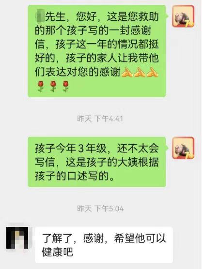 收到信后,资助女孩的女士亲切地称呼女孩为“闺女”,并请工作人员转告孩子安心学习,她将资助女孩直至大学毕业;资助男孩的先生则朴实地说:“健康就好。”