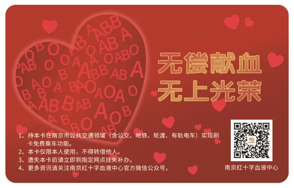 为方便《江苏省无偿献血荣誉证》(以下简称“三免卡”)持有者在我市公共交通领域实现刷卡免费乘车功能,促进惠民便民政策的落实,20239月,南京地区“三免卡”正式实现刷卡乘车的功能!专属卡—“献血爱心卡”(市民卡B卡)正式上线。