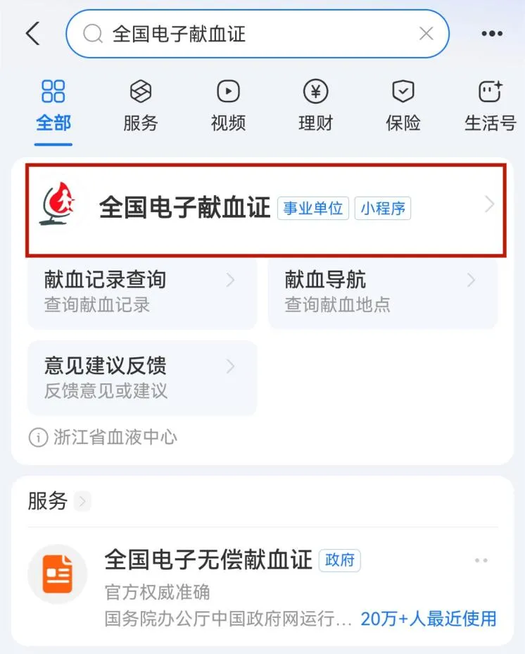 第一步:微信或支付宝搜索登录“全国电子献血证”小程序。