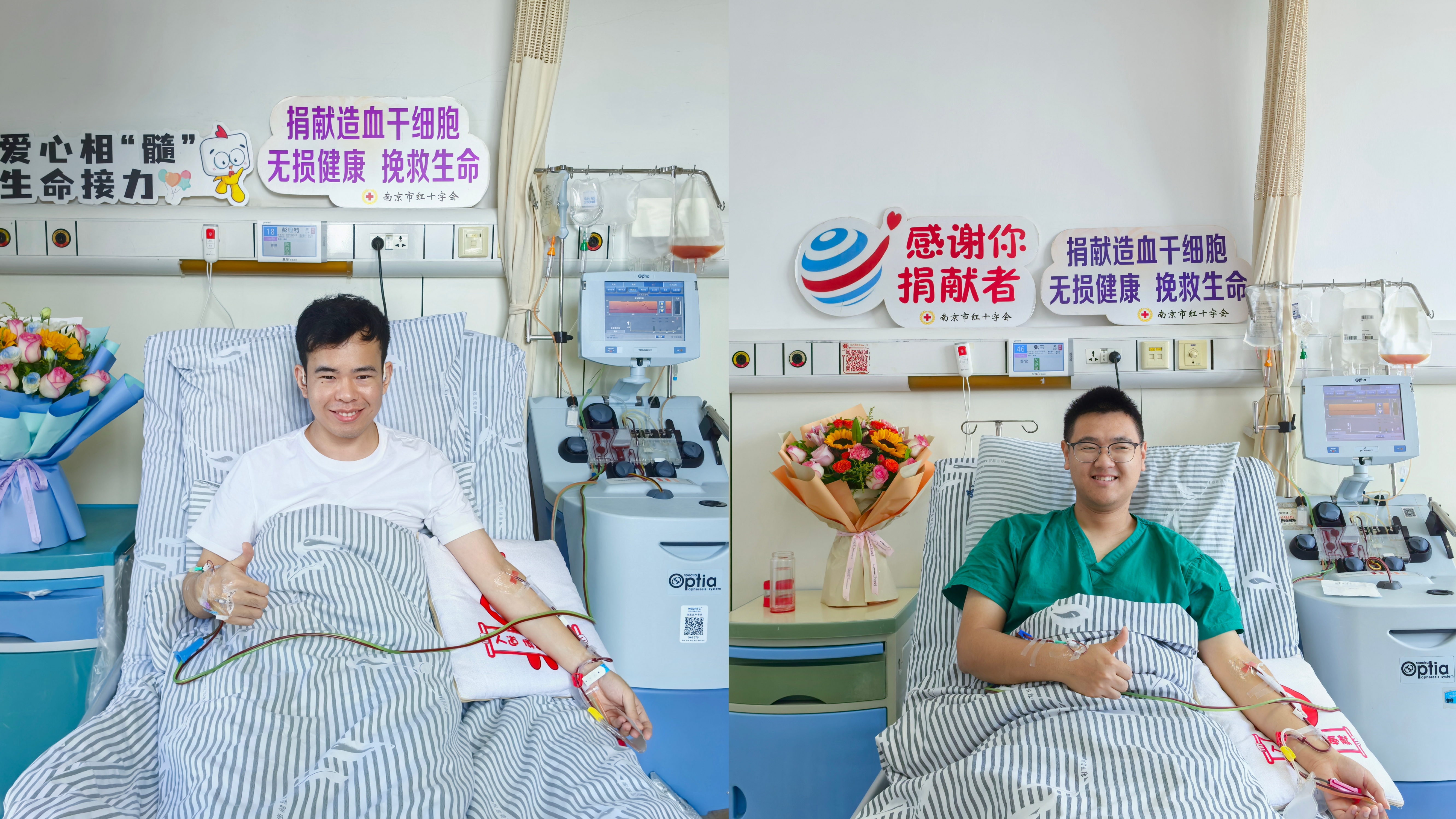 11月26日,东南大学附属中大医院的造血干细胞采集室内,一场不期而遇的善举悄然上演:大学生彭显钧与医务工作者张玉于同日成功捐献造血干细胞。两份承载生命希望的“礼物”,将跨越千山万水,为两位素未谋面的血液病患者点燃重生之光。